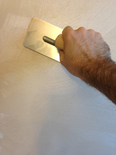 Нанесение шпателем или валиком третьего равномерного слоя неразбавленной декоративной краски MAG-CARMA. По мере высыхания материала (зависит от температуры и влажности помещения) приглаживать поверхность чистым шпателем круговыми или разнонаправленными движениями без нажима (для желаемого эффекта применять от 2-4-х подходов).